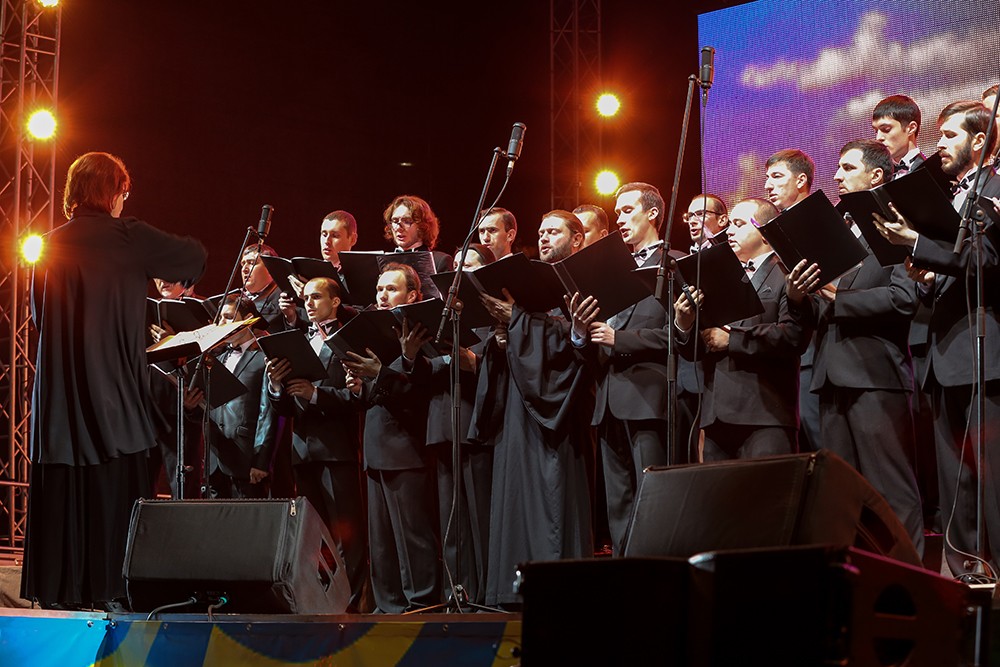 Первыми на сцену поздравить тираспольчан с праздником вышли местные артисты. Приднестровский государственный хор, заслуженные артистки республики Анастасия Кушнир и Наталья Кирка.
