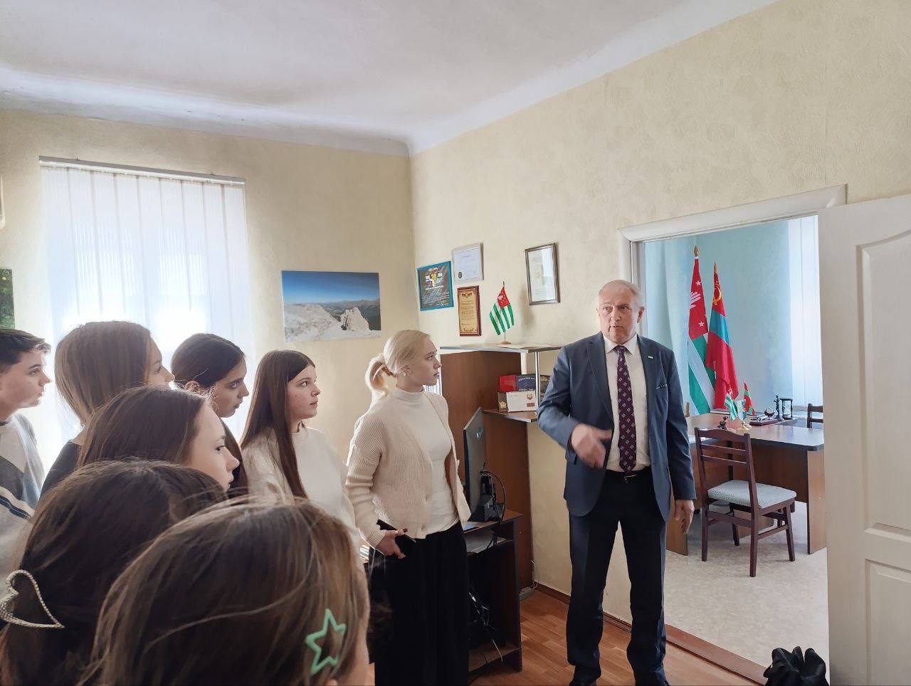 В рамках визита он провел экскурсию по представительству, познакомив ребят с его деятельностью и значением в укреплении связей между Приднестровьем и Абхазией. Александр Ватаман рассказал об истории Абхазии, особо подчеркнув борьбу абхазского народа за независимость, а также о культурных и исторических особенностях республики.