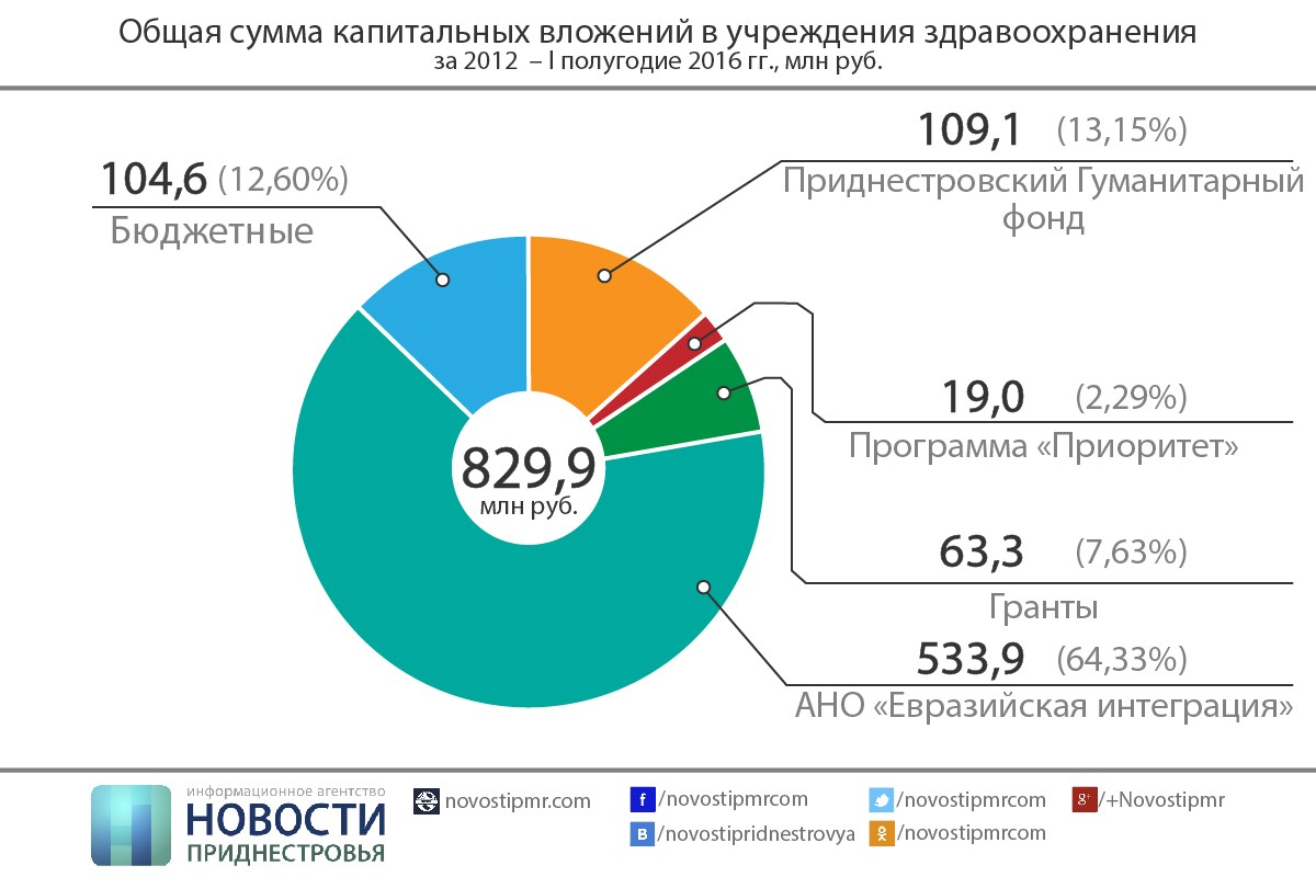 Российская автономная некоммерческая организация «Евразийская интеграция», курируемая вице-премьером РФ Дмитрием Рогозиным, профинансировала свои проекты в сфере здравоохранения на 533,9 миллионов рублей ПМР – это 64,93% от общей суммы. Ещё 19 миллионов рублей (2,29%) было направлено в медицину по президентской программе «Приоритет» - большому проекту по реконструкции объектов социальной инфраструктуры. Привлекались также и международные гранты – в общей структуре вложений в здравоохранение их доля составила 7,63%, или 62,3 миллиона рублей.