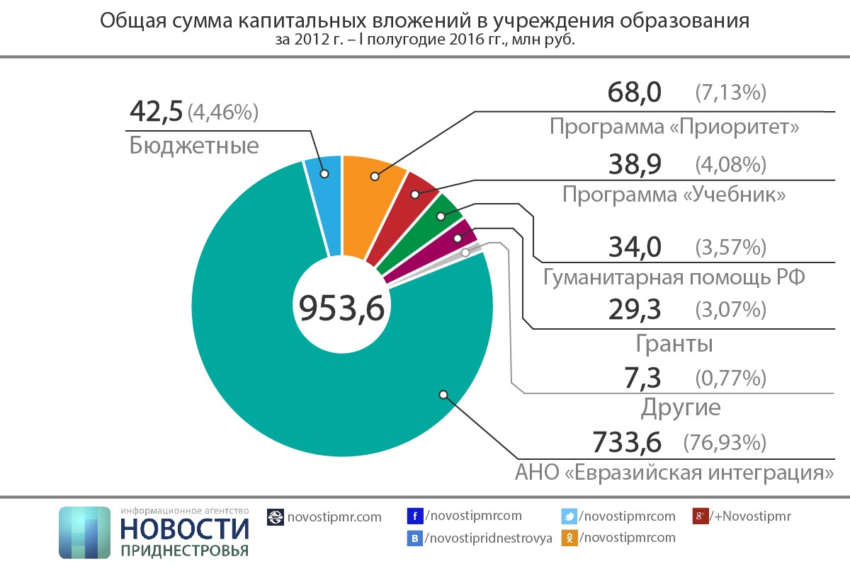 По размерам капитальных вложений в образование лидерство также принадлежит АНО «Евразийская интеграция». На её долю приходится 76,9% от общей суммы инвестиций, или 733,6 миллионов рублей ПМР. Россия также участвовала в финансировании программы «Учебник» и «Приоритет» - 38,9 и 68 миллионов рублей ПМР соответственно. Ещё 34 миллиона в образование пришли в виде российской гуманитарной помощи. Минпрос привлёк и 29,3 миллионов рублей международных грантов. Бюджетные же деньги составили в общем объеме инвестиций лишь 4,46%, или 42,5 миллиона рублей.