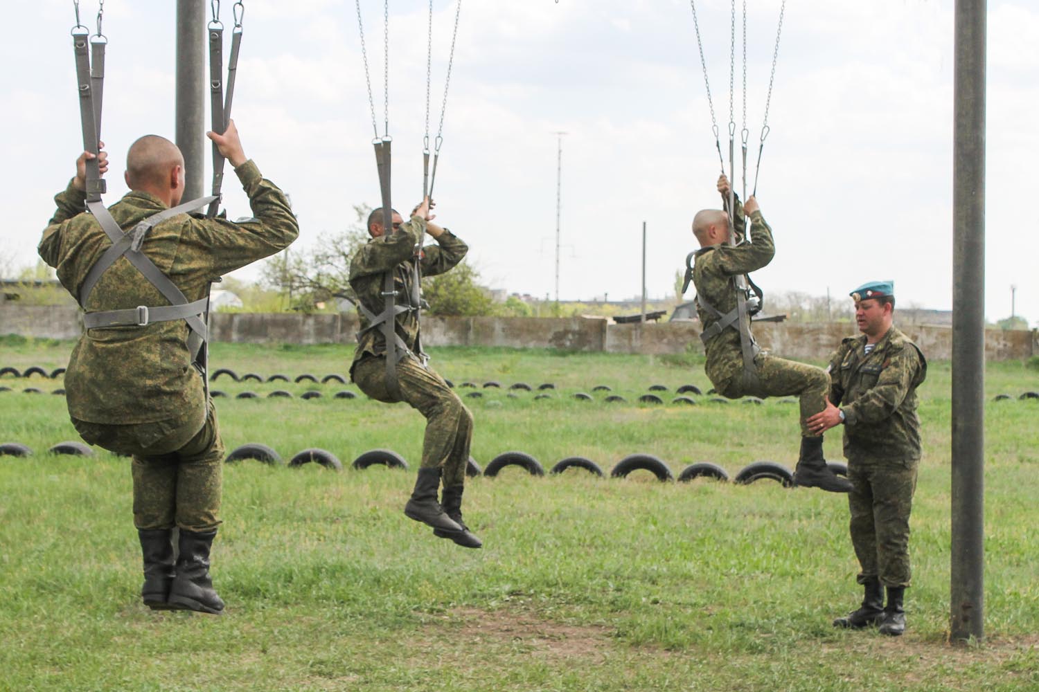 Солдаты и будущие инструкторы отрабатывают порядок действий десантника при совершении учебно-тренировочных прыжков