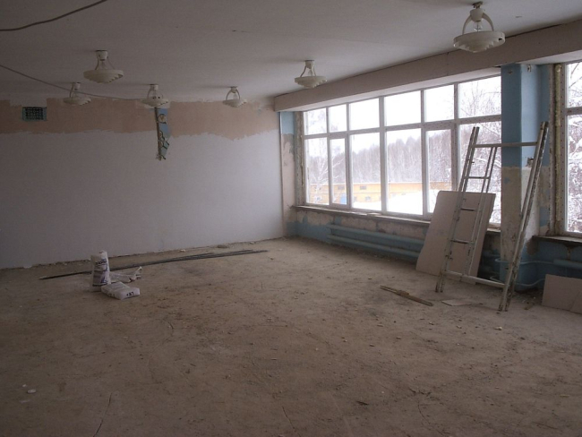 Сгнившие деревянные полы демонтированы. Вместо них установлена бетонная стяжка, на которой будет резиновое покрытие. Кроме спортзала приводят в порядок и раздевалки.