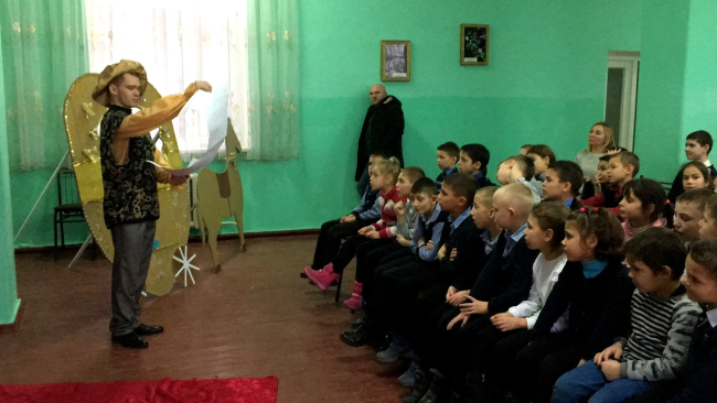 В качестве поздравления гости показали детям новогоднюю сказку, в завершение праздника подарили зрителям сладкие новогодние наборы.