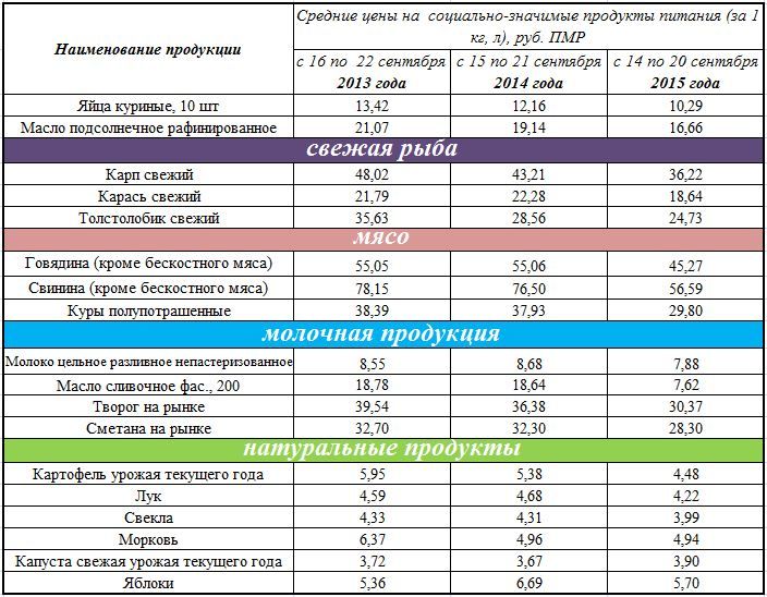 Подешевели, по сравнению с сентябрём 2014 года, и натуральные продукты: картофель (урожай этого года) — на 90 коп., лук — на 46 коп., свёкла — на 32 коп., яблоки — на 1 руб.