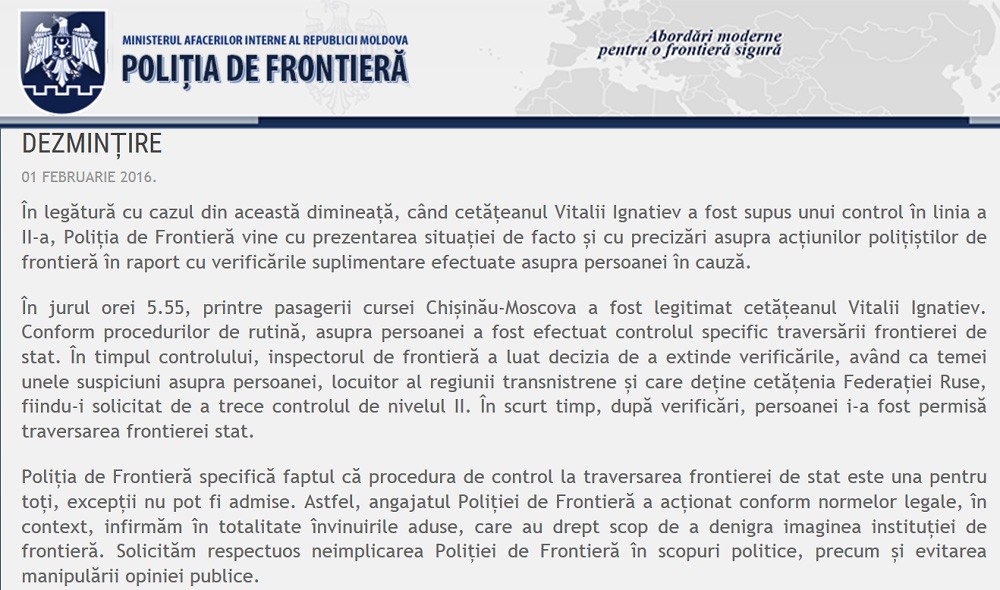 На официальном сайте погранведомства Молдовы были представлены «описание фактической ситуации» и «разъяснения действий пограничников». Согласно опубликованному «опровержению», миграционная полиция РМ «полностью отвергает обвинения в очернении пограничного ведомства» и призывает не манипулировать общественным мнением.
