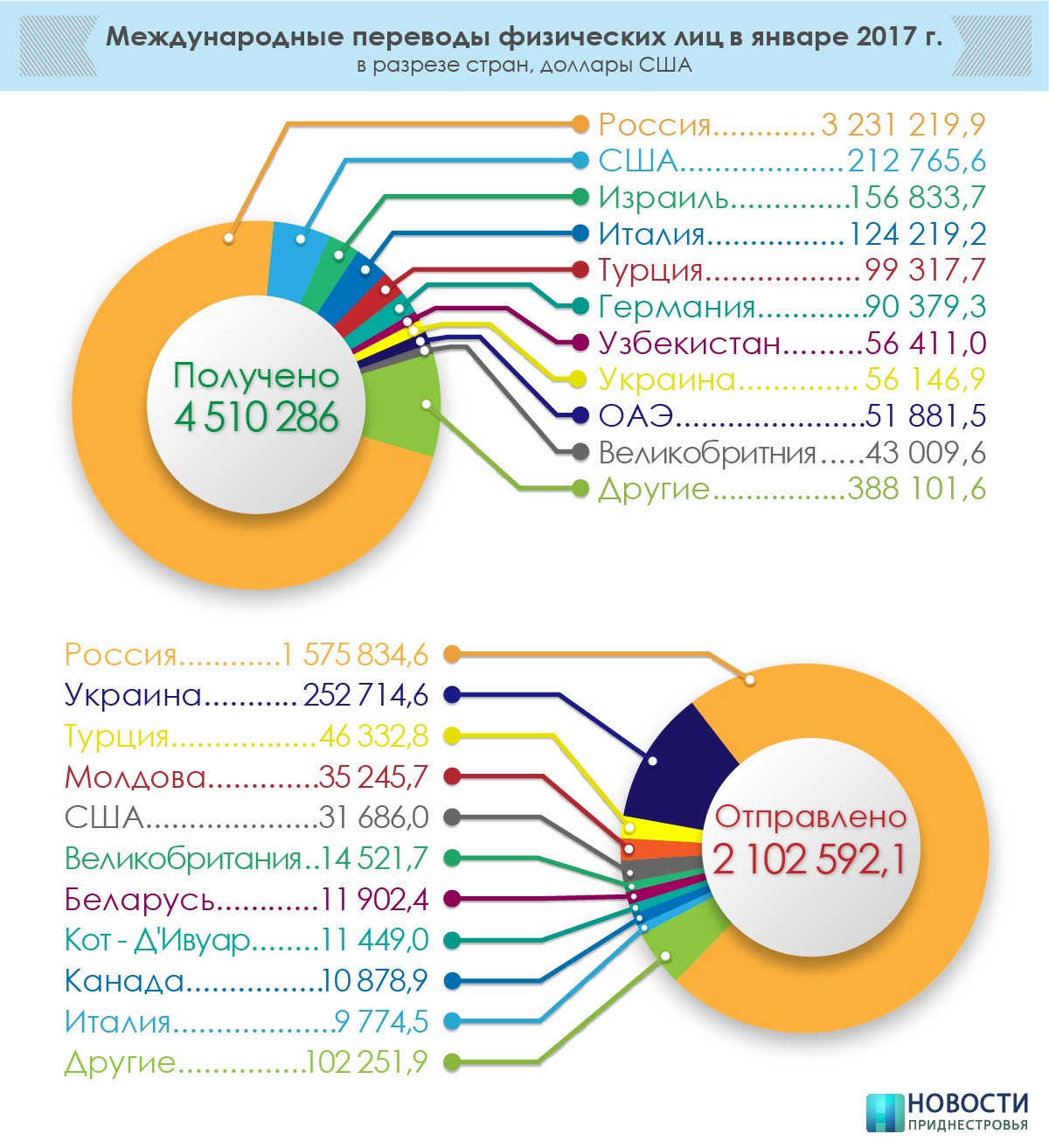 Больше всего (более 1,5 млн) жители республики отправляли переводы в январе также в Россию. Также в лидерах по трансфертам из ПМР — Украина и Турция.