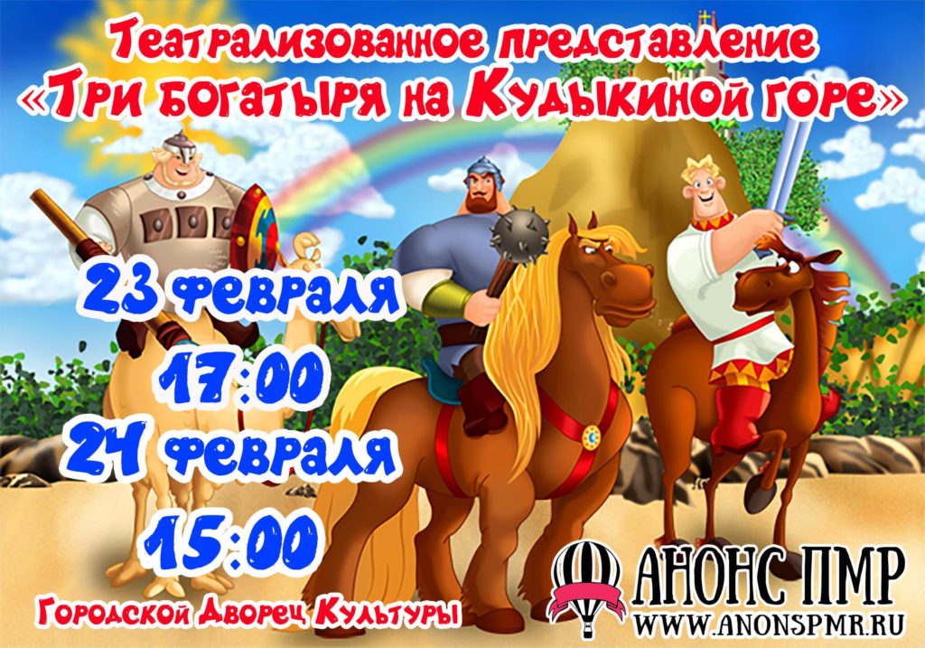 23 февраля в большом зале столичного Дворца культуры состоится театрализованное представление «Три богатыря на Кудыкиной горе». Спектакль подготовит народный драматический коллектив «Театральная гостиная».