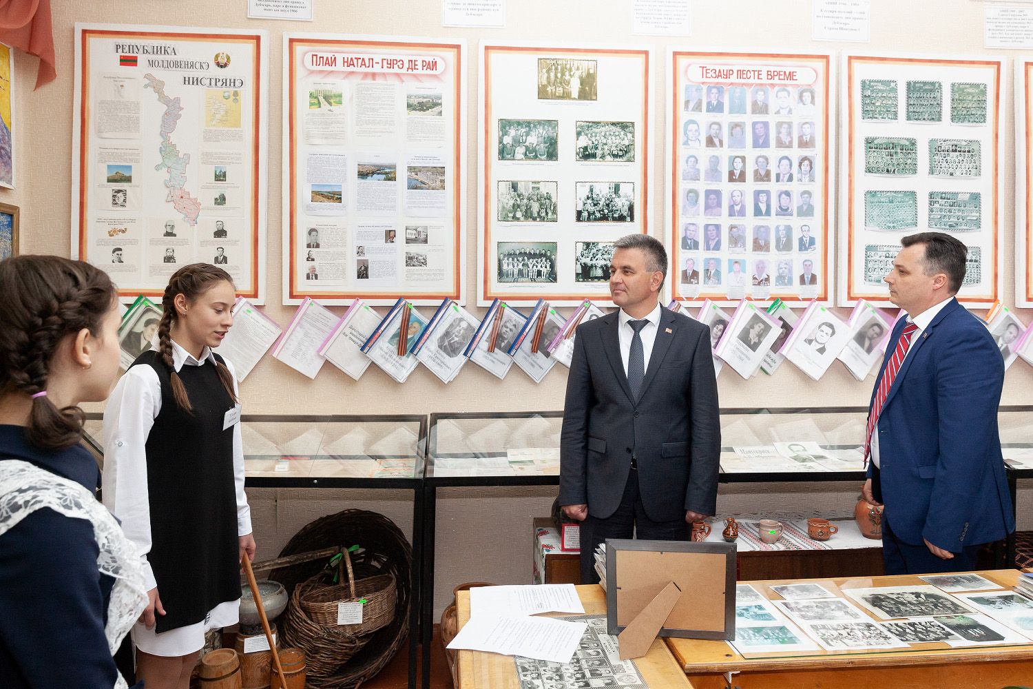 «Национальное искусство – это визитная карточка любого народа. У нас в музее находятся экспонаты, которые изготовлены нашими прадедами: это ткацкий станок ручной работы XIX века. Он и сегодня в рабочем состоянии, на нем ткали ковры, напольные покрытия и национальные рушники. На таком старинном станке был соткан ковер, который висит на стене нашего Центра молдавской культуры», – рассказала президенту ученица – одна из гидов школьного музея. Центр молдавской культуры, о котором упомянула школьница, глава государства тоже посетил. Аналог ему есть только в Тирасполе, рассказали Вадиму Красносельскому.