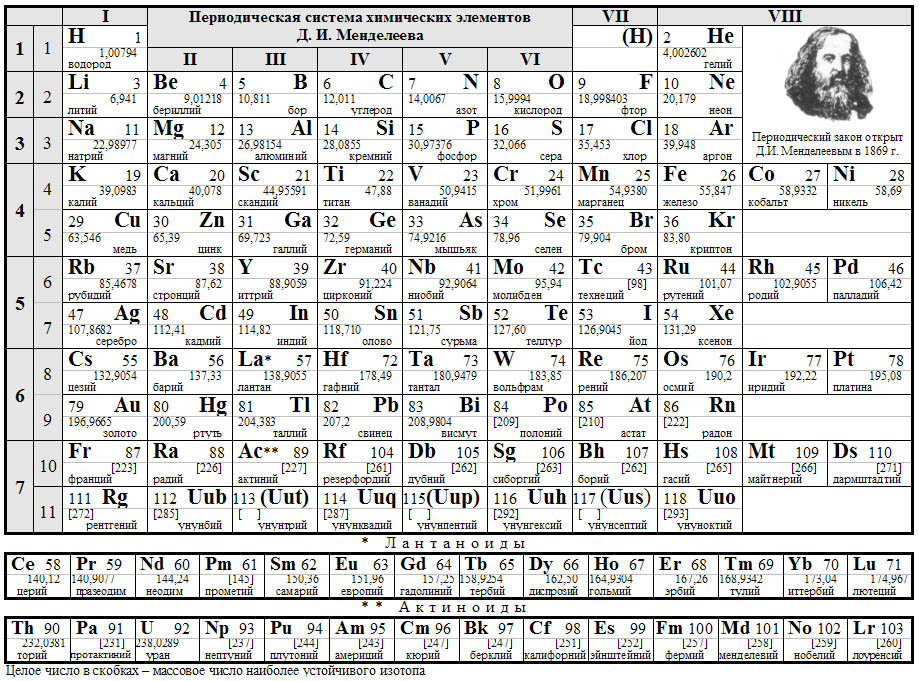 Таблица Менделеева – это классификация химических элементов, устанавливающая зависимость различных свойств элементов от их заряда атомного ядра. Всего предложено несколько сотен вариантов изображения периодической системы (аналитические кривые, таблицы, геометрические фигуры и т.п.). В современном варианте системы предполагается сведение элементов в двумерную таблицу, в которой каждый столбец (группа) определяет основные физико-химические свойства, а строки представляют собой периоды, в определённой мере подобные друг другу.