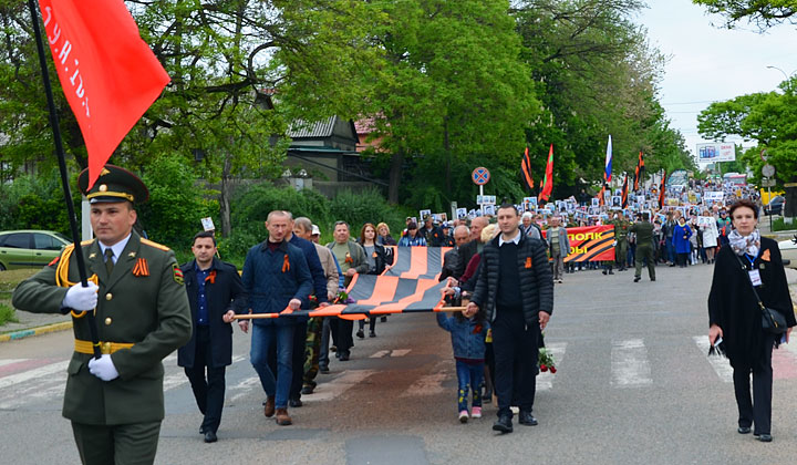 Около пяти тысяч дубоссарцев приняли участие в шествии, которое возглавили военнослужащие с портретами героев Советского Союза. Следом за ними горожане несли многометровую георгиевскую ленту.