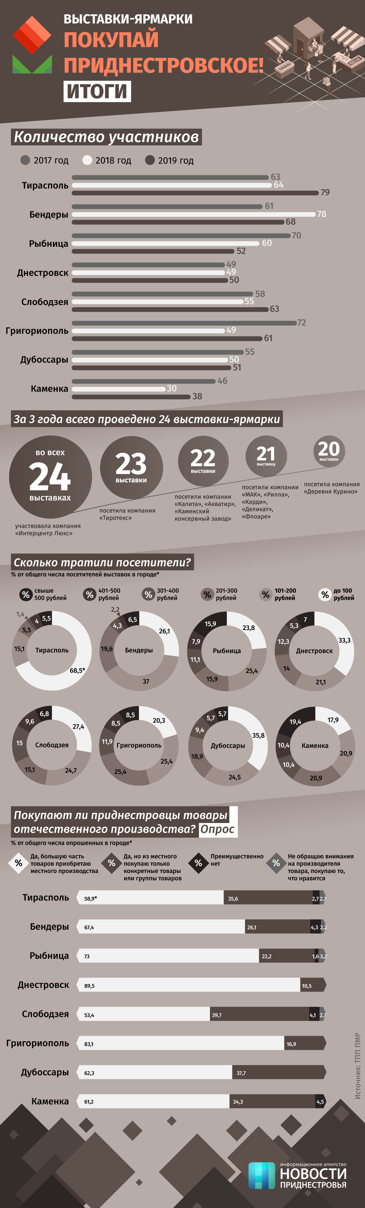 Больше всего покупок совершили жители Каменки и Рыбницы: каждый пятый посетитель потратил более 500 рублей. В целом по 8-ми городам треть опрошенных гостей отметили, что потратили менее 100 рублей. Каждый четвёртый посетитель выставки-ярмарки тратил до 200 рублей на товары, произведённые в Приднестровье.