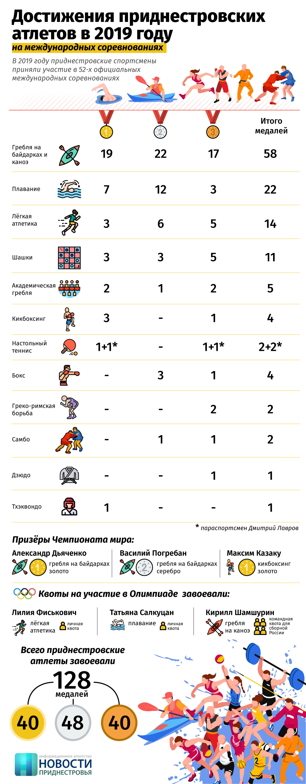 Тирасполь, 5 марта. /Новости Приднестровья/. Ежегодно приднестровские спортсмены заявляют о себе на различных международных и мировых стартах. Среди наших атлетов есть призёры и победители чемпионатов Европы, мира, Олимпийских игр и других престижных соревнований. О достижениях приднестровских спортсменов на международных соревнованиях в 2019 году расскажем в инфографике.