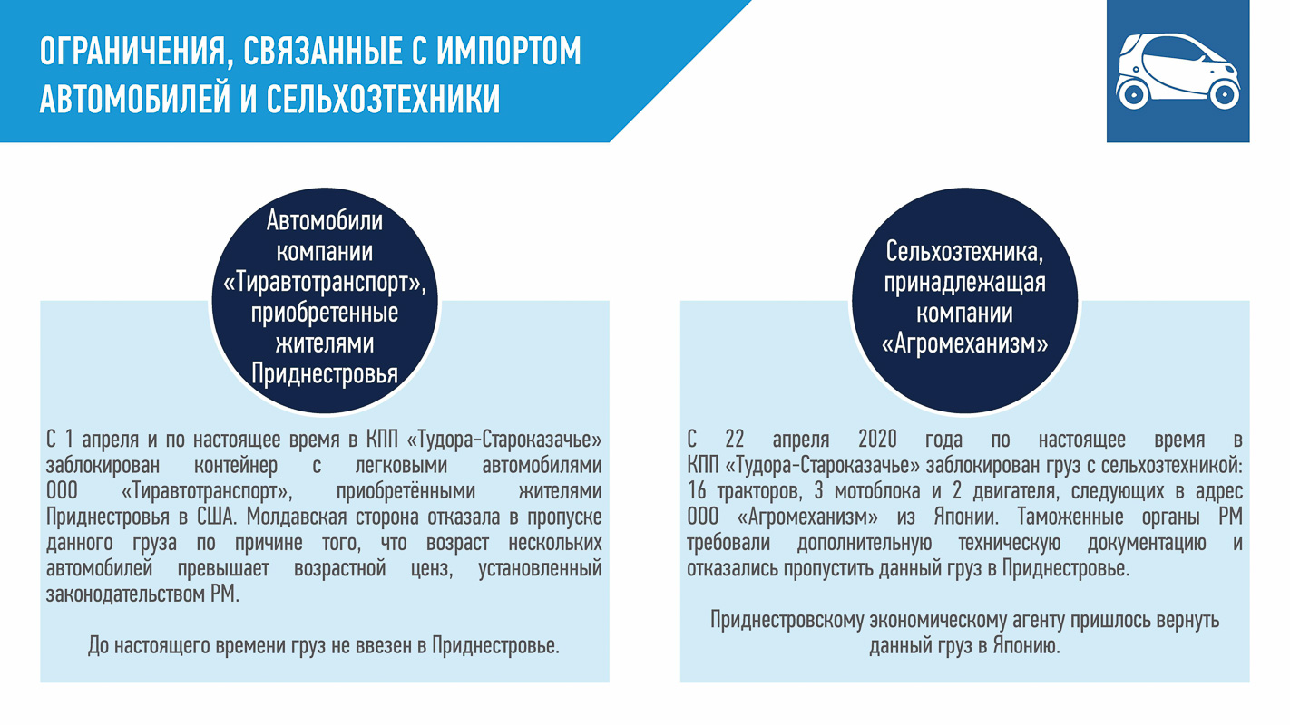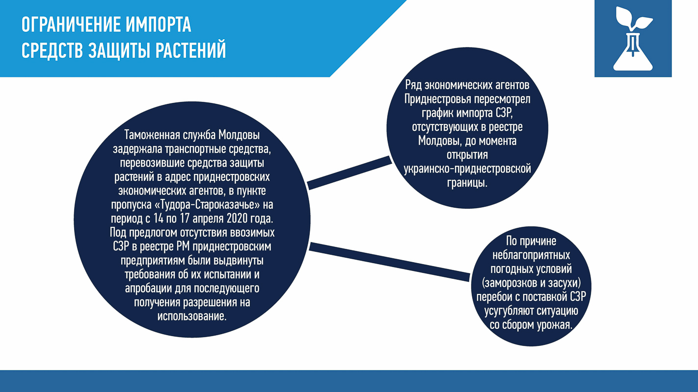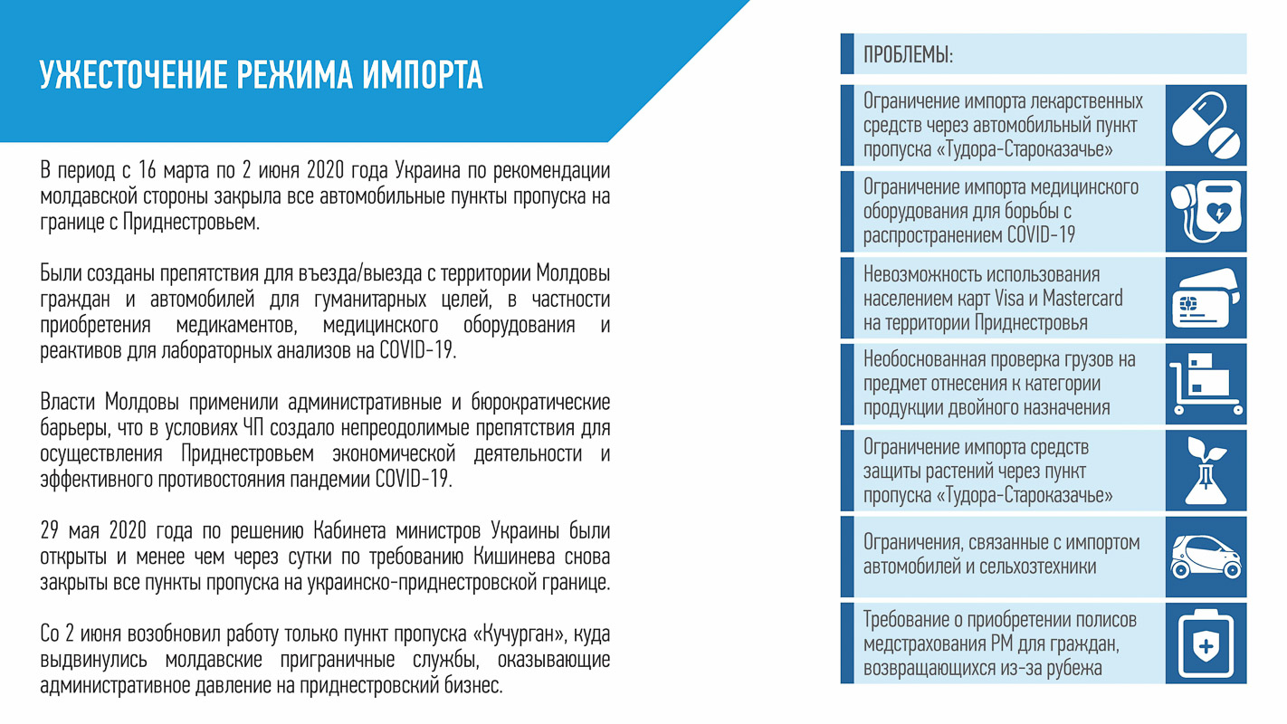 Министерство иностранных дел ПМР обнародовало факты давления Молдовы на Приднестровье в период борьбы с пандемией СOVID-19. Среди инструментов Кишинёва - ограничение импорта лекарственных средств, медоборудования, средств защиты растений и техники. При этом Молдова избегает экспертного диалога. О том, какие проблемы создаёт РМ Приднестровью, можно узнать из опубликованной презентации: