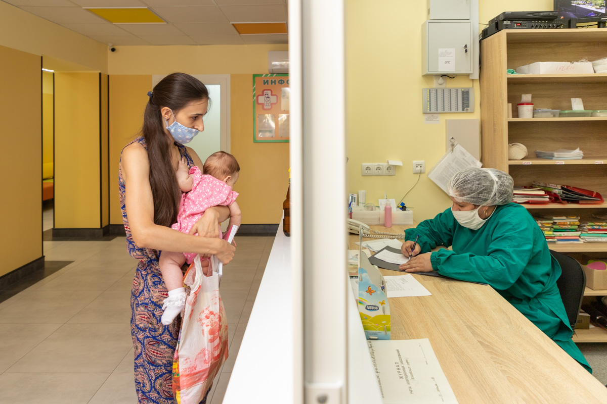 Приём в поликлинике ведётся исключительно по записи с соблюдением всех профилактических мер: дезинфекция рук на входе, измерение температуры тела, наличие маски.