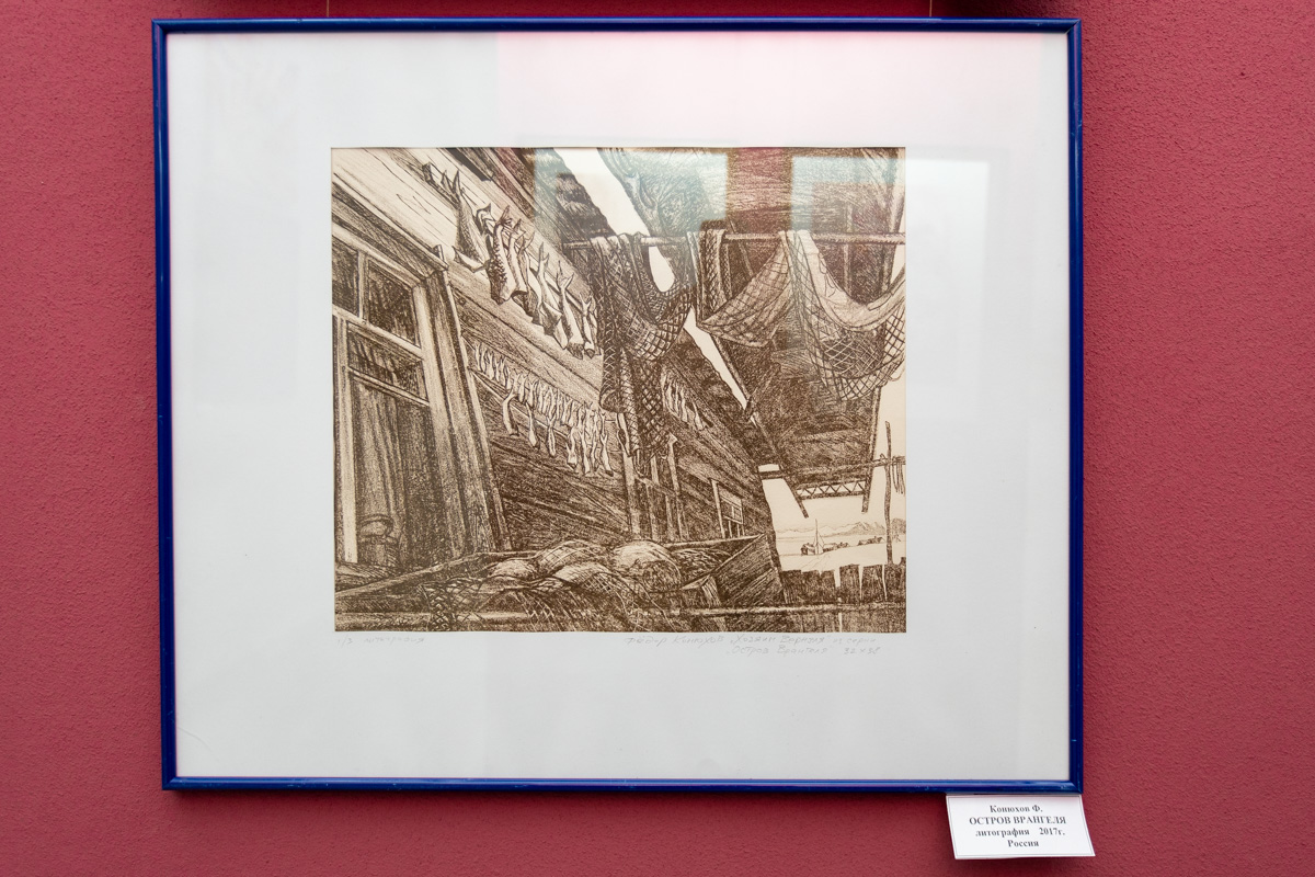 Среди множества красочных полотен, представленных на выставке, можно найти черно-белую литографию известного российского путешественника Фёдора Конюхова.