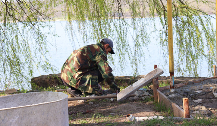 Площадку на этом месте уже благоустроили: уложили бетонные плиты. Кроме этого, необходимо залить бетонный пол в беседке на берегу.