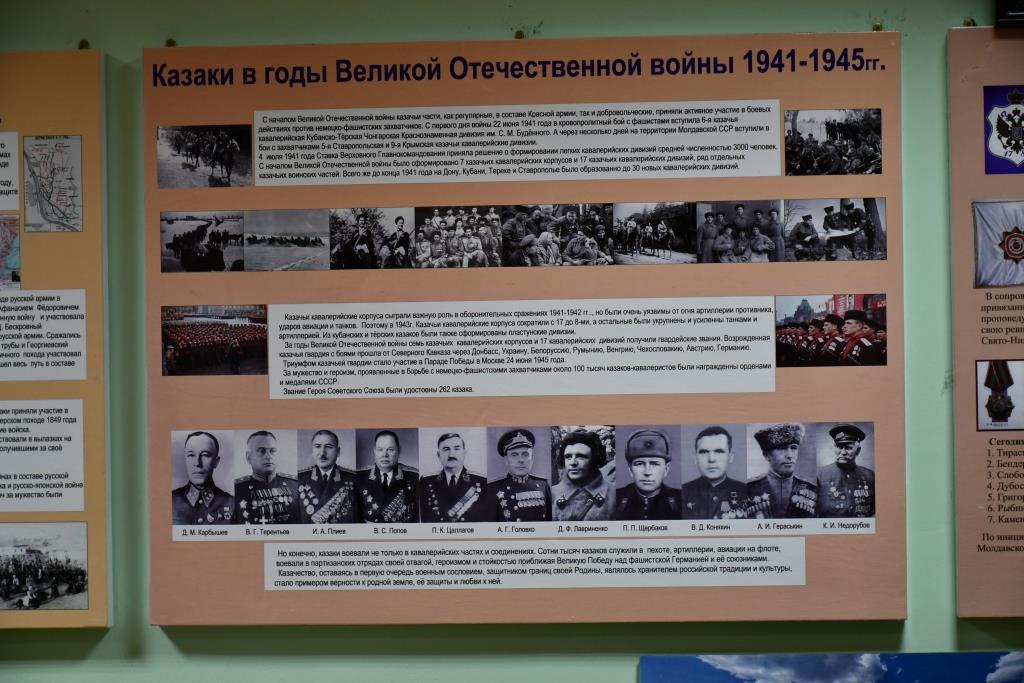 Хроника военных лет и биографии казаков, участвовавших в Великой Отечественной войне, отображены и на стенде в музее Черноморского казачьего войска. Казаки воевали в партизанских отрядах, служили в пехоте, артиллерии, танковых войсках, авиации.
