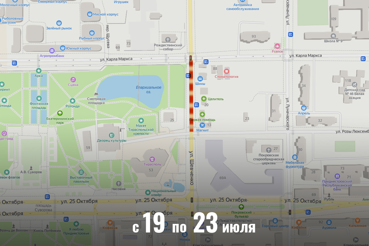 Тирасполь, 20 июля. /Новости Приднестровья/. В Тирасполе с 19 по 23 июля частично перекрыли движение для транспорта по улице Шевченко. Ограничение коснулось участка дороги от ул. Р. Люксембург до ул. К. Маркса.