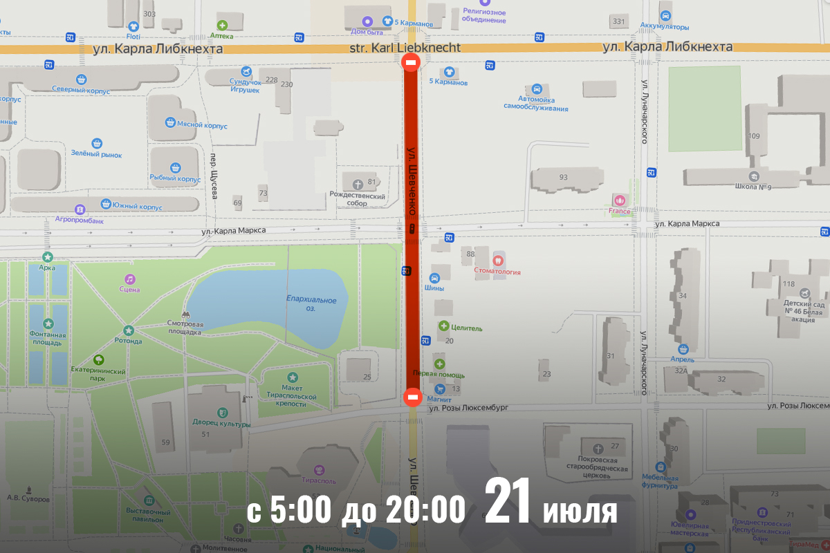21 июля с 5:00 до 20:00 ул. Шевченко полностью перекроют на участке от ул. Р. Люксембург до ул. К. Либкнехта. На этих участках будут ремонтировать изоляционное покрытие подземного газопровода.