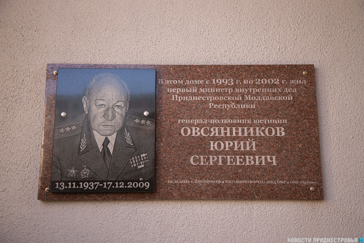 Тирасполь, 12 ноября. /Новости Приднестровья/. В Тирасполе на доме № 2 по улице Милёва открыли мемориальную доску генерал-майору милиции, генерал-полковнику юстиции Юрию Овсянникову. С 1992-го по 1994 год он возглавлял Министерство внутренних дел ПМР, с 1994-го по 2000-й – Министерство юстиции ПМР.