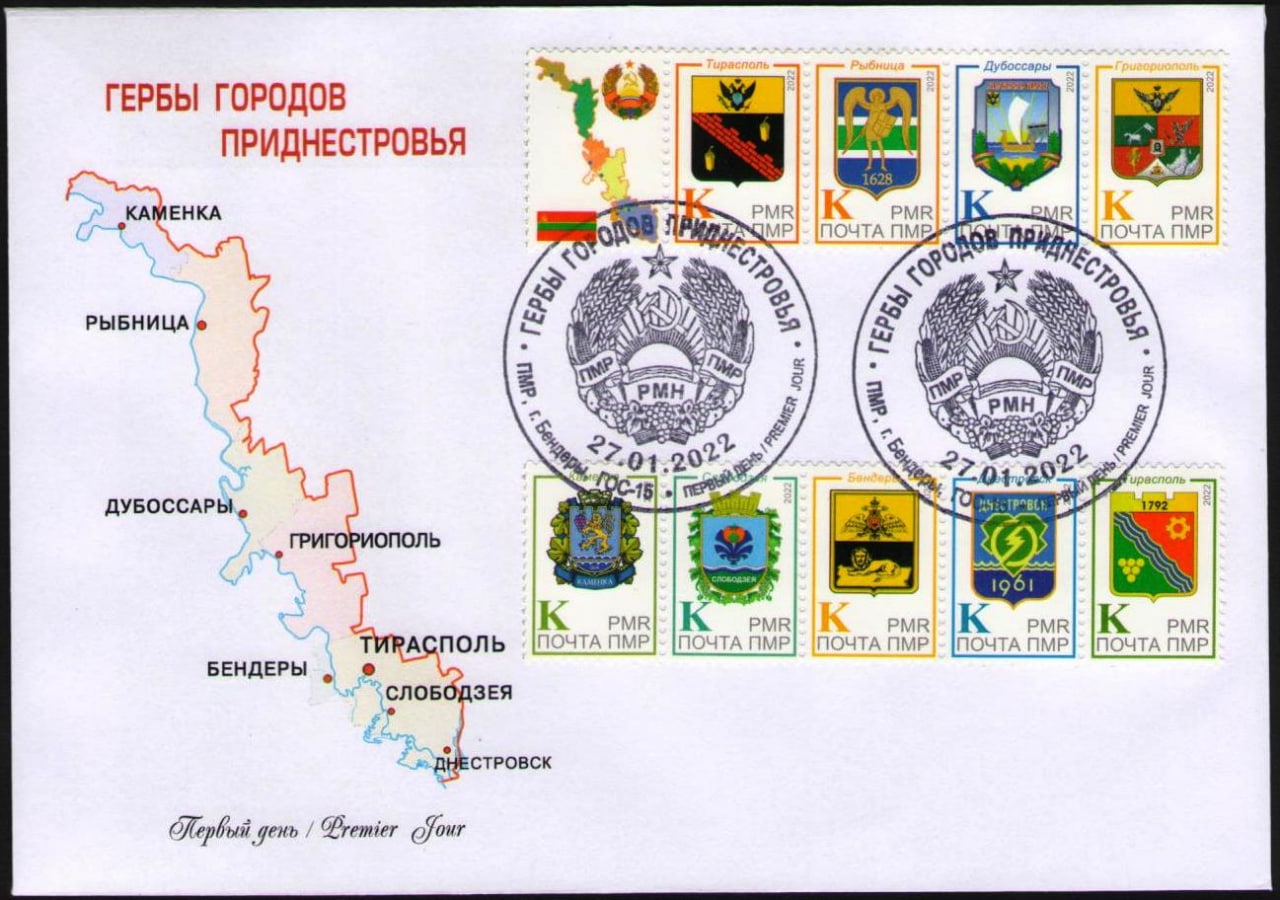 А также пройдёт специальное гашение серии почтовых марок 22-го стандартного выпуска «Гербы городов Приднестровья». Серия состоит из 9 марок.