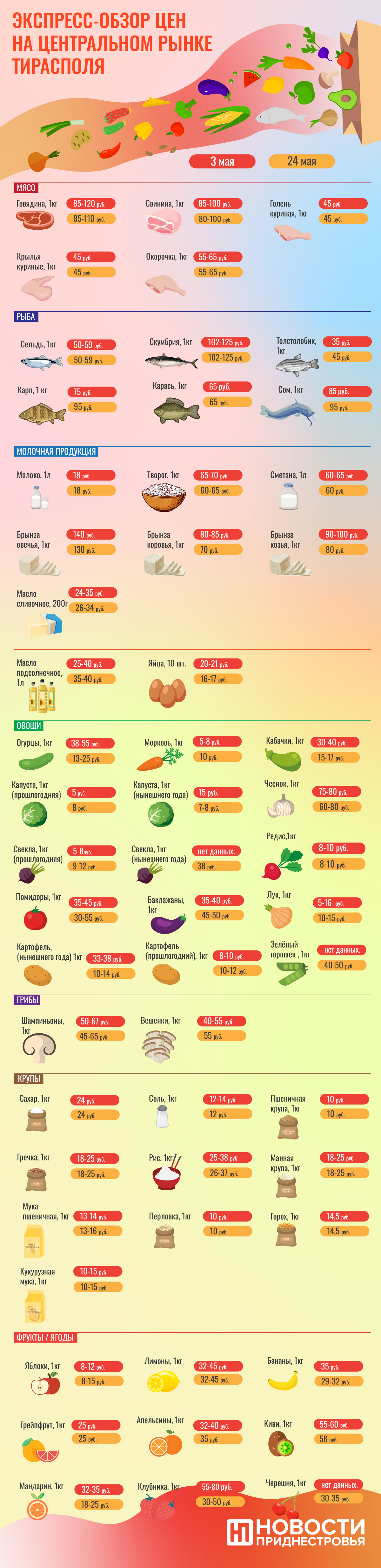 Тирасполь, 24 мая. /Новости Приднестровья/. Перед выходными на Зелёном рынке Тирасполя многолюдно. Сегодня там побывал наш корреспондент и узнал стоимость различных продуктов питания.
