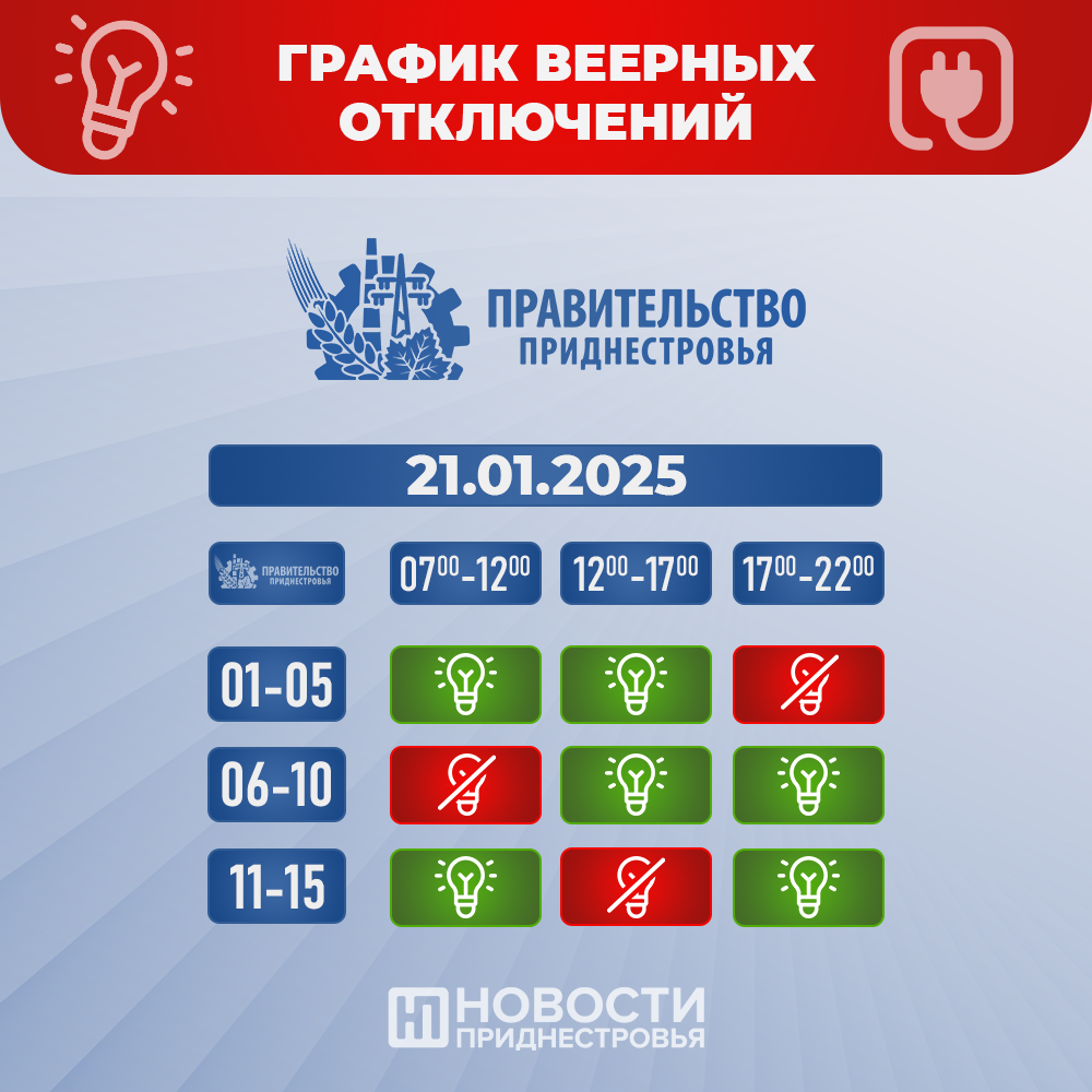 Тирасполь, 21 января. /Новости Приднестровья/. Сегодня веерные отключения электроэнергии будут производиться по группам по городам и районам Приднестровья 1 раз в сутки на 5 часов.