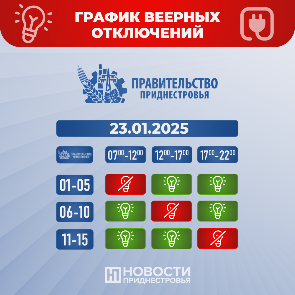 Тирасполь, 22 января. /Новости Приднестровья/. Оперштаб публикует график веерных отключений электроэнергии на 23 января.