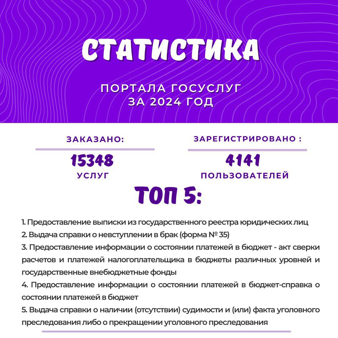 Посредством портала в прошлом году гражданами было заказано 15 348 госуслуг. В сравнении с 2023-м этот показатель увеличился на 6%. В числе наиболее приоритетных запросов – предоставление выписки из государственного реестра юридических лиц, выдача справки о невступлении в брак, предоставление информации о состоянии платежей в бюджет и не только.