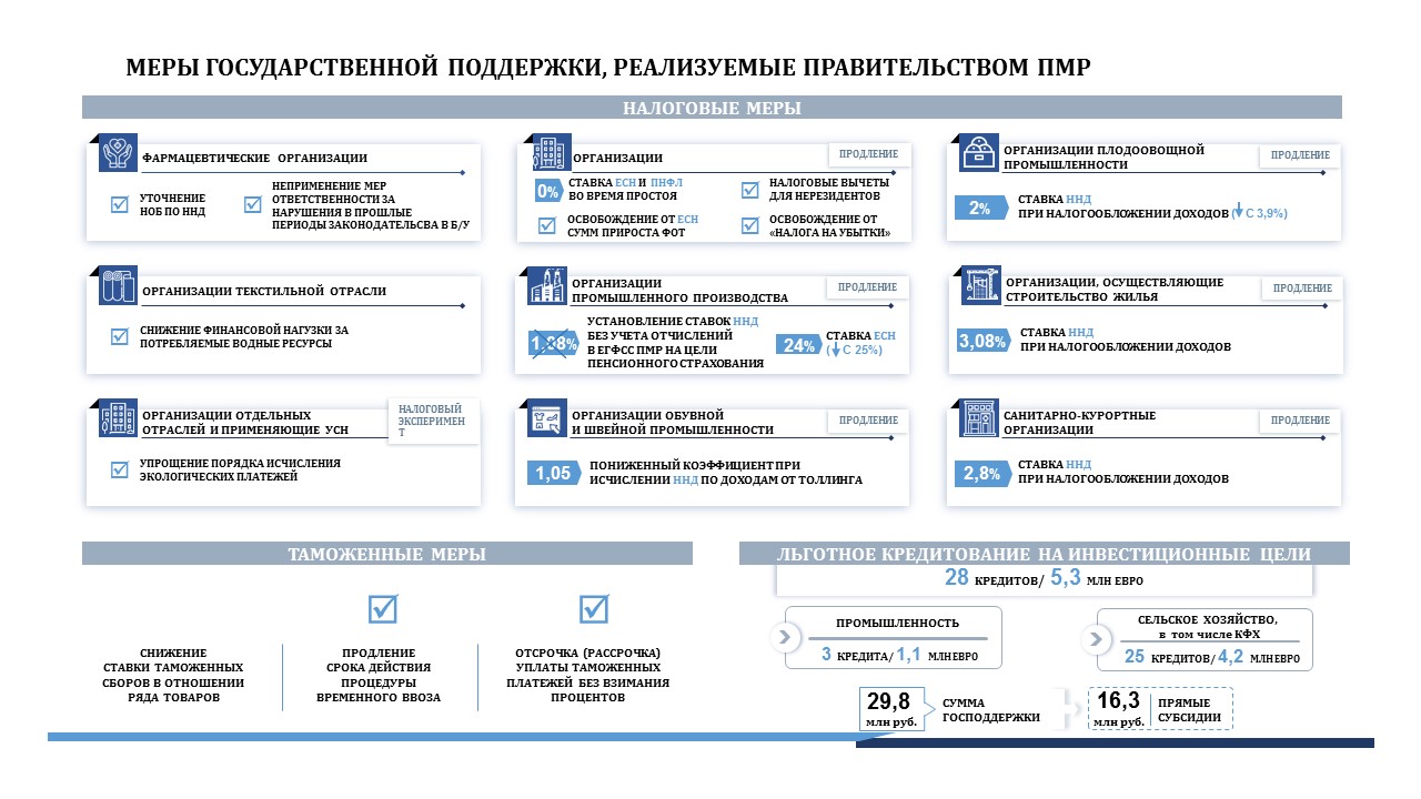 С целью нивелирования негативных последствий влияния внешних факторов на экономическое и социальное развитие республики, а также во исполнение поручения Президента, озвученного в Послании, Правительством была проработана и предложена пролонгация мер государственной поддержки хозяйствующих субъектов на 2024 год, которую поддержал Верховный Совет.