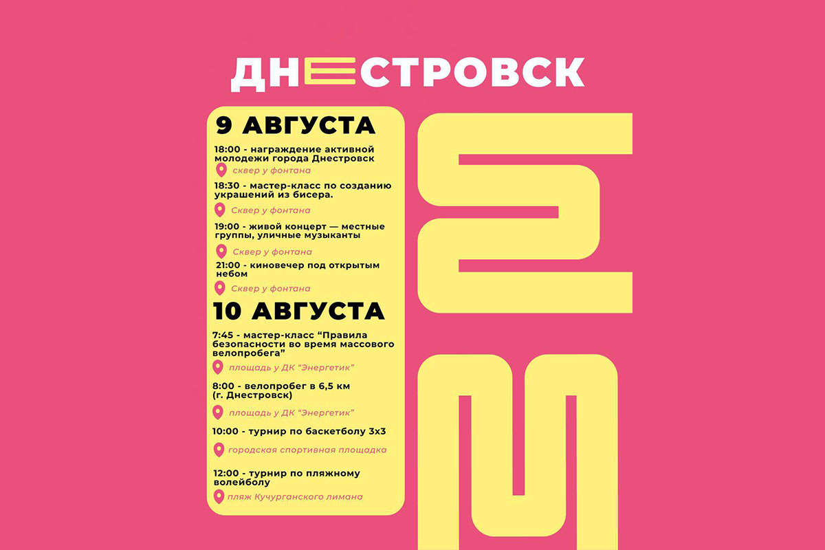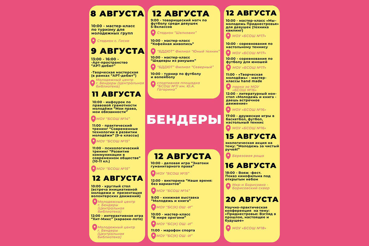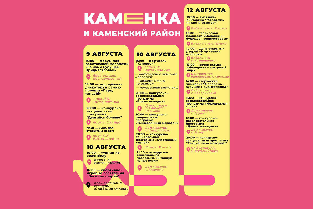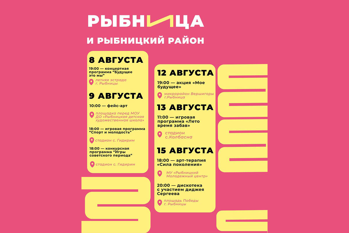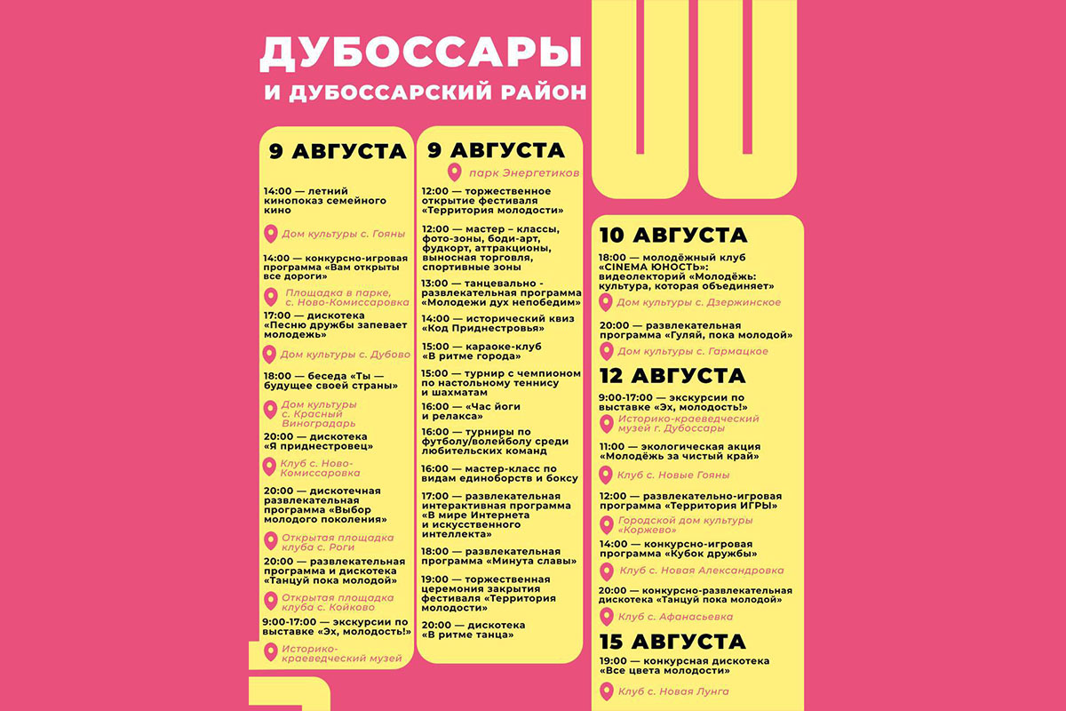 9 августа в 15:00 начнется форум для работающей молодежи «За нами будущее Приднестровья». Ожидается интересная программа с разнообразными площадками: творческими, спортивными, интеллектуальными. Также будет время для неформального общения и отдыха.
