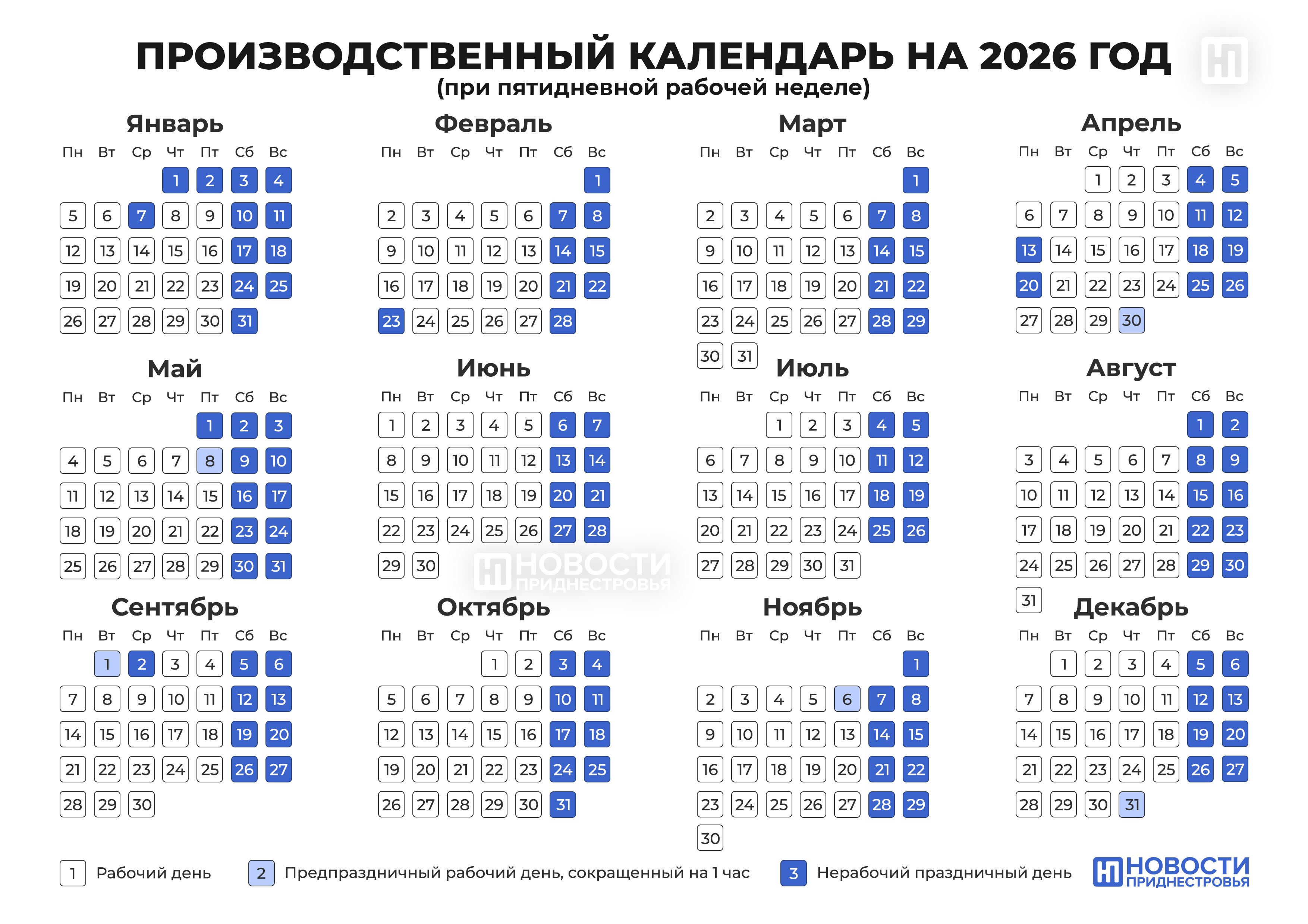 Тирасполь, 5 сентября. /Новости Приднестровья/. Министерство по социальной защите и труду ПМР утвердило и опубликовало производственный календарь на 2026 год. Он разработан как для пятидневной, так и для шестидневной рабочей недели.