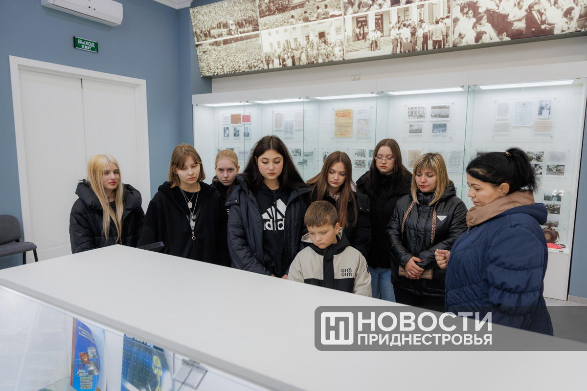 В Историко-краеведческом музее в столице их ждал опытный экскурсовод, который начал свой рассказ в зале Становления и развития приднестровской государственности. Внимание школьников привлекло многообразие экспонатов: фотографии, официальные документы, награды, личные вещи участников молдо-приднестровского конфликта и многое другое.