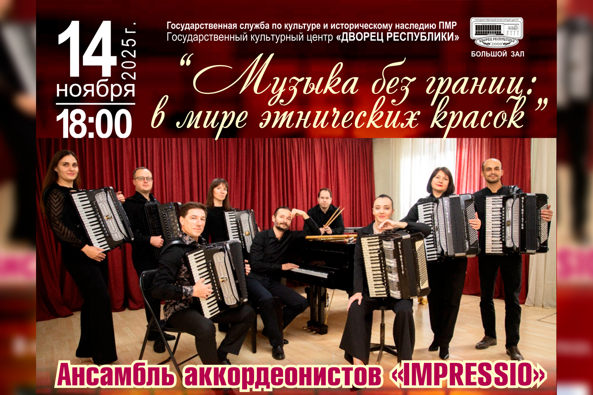 Тирасполь, 12 ноября. /Новости Приднестровья/. В тираспольском Дворце Республики 14 ноября ансамбль аккордеонистов «Импрессия» сыграет концерт «Музыка без границ: в мире этнических красок», сообщает Первый Приднестровский телеканал.