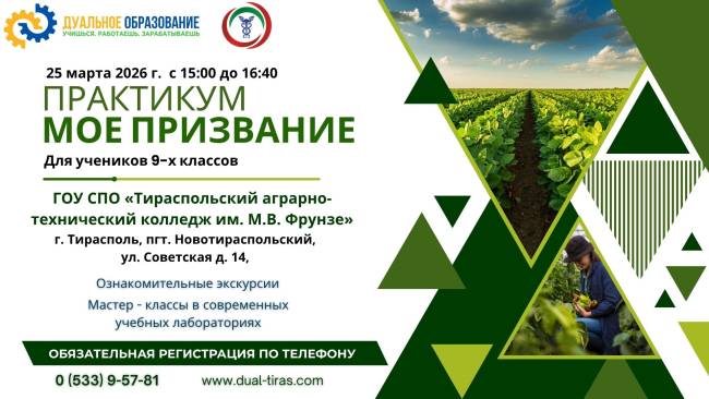 - 25 марта (15:00-16:40) Тираспольский аграрно-технический колледж им. М. В. Фрунзе – мастер-классы по специальностям «Агрономия» и «Мехатроника в отрасли сельского хозяйства».