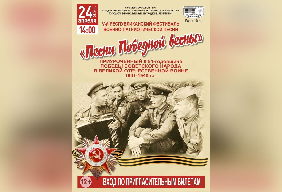 Тирасполь, 14 апреля. /Новости Приднестровья/. 24 апреля в Тирасполе пройдет пятый Республиканский фестиваль военно-патриотической песни «Песни Победной весны», посвященный 81-й годовщине Победы советского народа в Великой Отечественной войне.