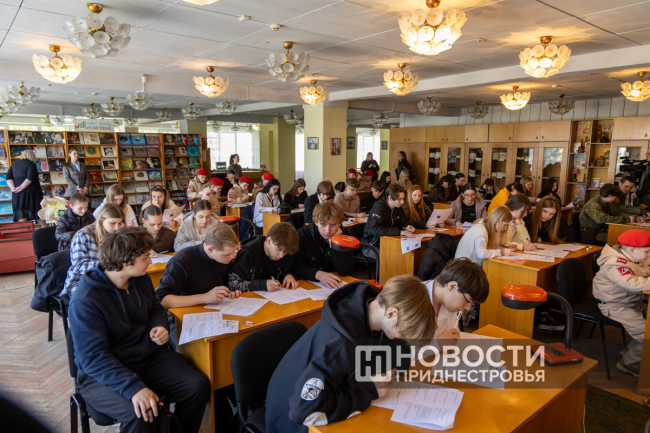 Тирасполь, 24 апреля. /Новости Приднестровья/. Сегодня в России и во многих странах мира проходит акция «Диктант Победы». Приднестровцы тоже участвуют в ней. Площадки развёрнуты во всех городах и районах республики. В Тирасполе – традиционно в центральной городской библиотеке им. А. С. Пушкина. В читальный зал пришли: несколько десятков старшеклассников из школы № 11, юнармейцы и молодёжь из Военно-спортивного клуба «Искра».