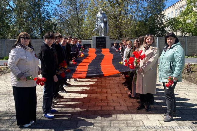 Ученики школы посетили местный Мемориал Славы, возложили цветы и развернули большую георгиевскую ленту