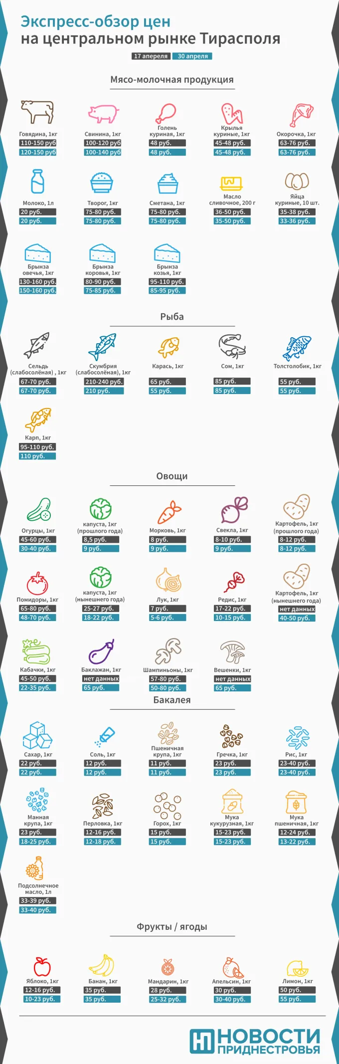 Тирасполь, 30 апреля. /Новости Приднестровья/. На Зелёном рынке Тирасполя подешевели овощи - огурцы, молодая капуста, помидоры, кабачки и редис, живой карась, а также брынза козья и коровья. А вот свинина подорожала. Подробнее о ценовых изменениях на продукты питания за минувшие две недели читайте в нашем обзоре.