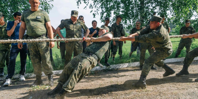 Военнослужащие играли в шашки, настольный теннис и волейбол, метали дротики, проверили свои силы в армрестлинге и перетягивании каната, преодолели эстафету