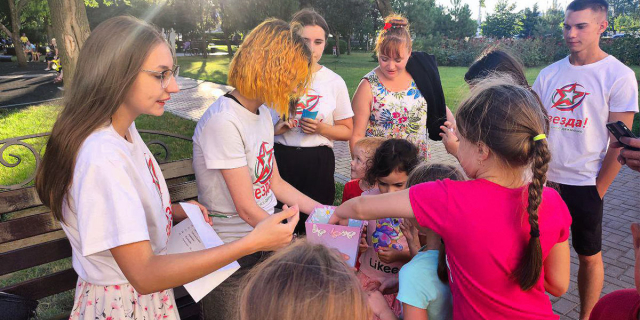 9 июля на улицах столицы молодые люди раздавали открытки и сладости